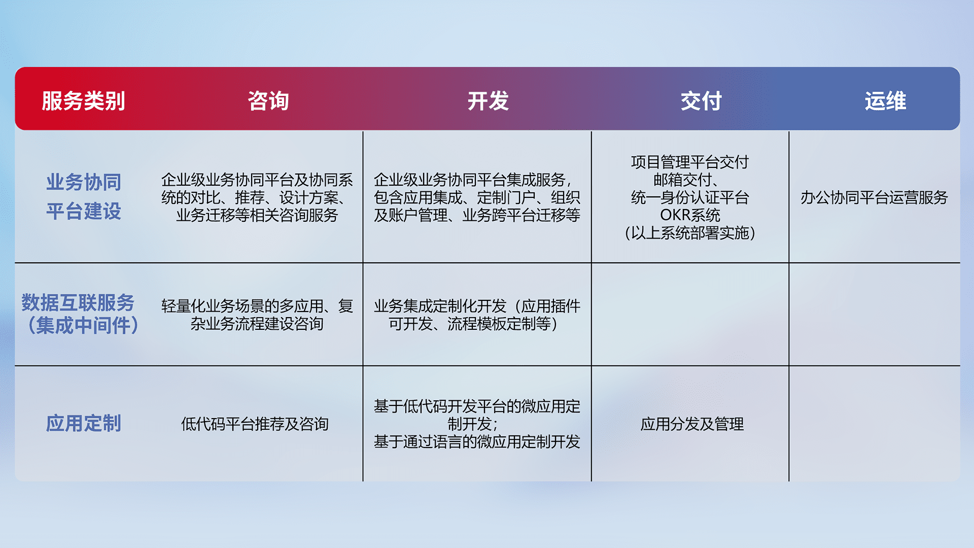 针对钉钉、、、、企微、、、、IDaas等平台级产品提供产品的规划、、、方案、、、、交付、、定制化开发等服务,,实现如统一协同办公、、智能客户服务、、、、混合会议管理、、、智能数据查询、、、、等业务场景,,,实现数字化转型。。。